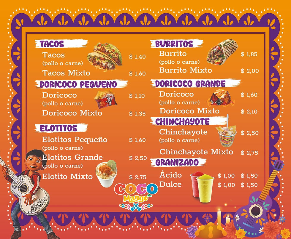 Si lo tuyo es comida con personalidad, este es tu lucar. Aquí, econtrarás tacos, burritos, elotes, dorilocos, chinchayotes y granizados refrescantes con estilo mexicano. El ambiente está lleno de color y buena vibra, pensado para que disfrutes con amigos o en familia mientras pruebas sabores intensos y auténticos.